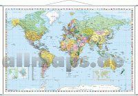 Wandkarte Welt, einseitig mit Folie beschichtet, dadurch beschreib- und abwischbar, mit Metalleisten und Aufhängeschnur versehen.