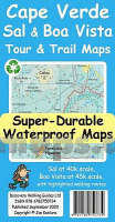 Doppelseitig bedruckte Wanderkarte von Kap Verde und Boa Vista. Zusätzlich gibt es Kartenausschnitte von Espargos, Santa Maria (Sal) und Sal Rei (Boa Vista) im Maßstab 1:10.000.