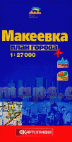Stadtplan von Makijiwka mit kyrillischer Beschriftung. Mit Innenstadtplan, Straßenverzeichnis und umfangreichem Adressteil über öffentliche Einrichtungen, Übernachtung u. a. Mit Überblick über die Stadtgeschichte. Kleine Umgebungskarte.