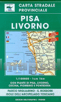 Straßenkarte für die Umgebung von Pisa und Livorno sowie die Inseln Elba, Monte Christo, Pianosa, Capraia und Gorgona. Die Landkarte enthält zusätzlich auf der Rückseite jeweils einen Stadtplan von Pisa, Livorno, Cecina, Piombino und Pontedera.