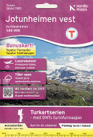 Hochwertige topographische Wanderkarte Jotunheimen West. Die Karte hat außerdem zwei extra Ausschnitte vom Fannaråki 1:25.000 und vom Galdhøpiggen 1:25.000.