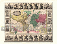 Farbenprächtiger Nachdruck, Lieferung gerollt, Blattgröße (B x H) 62 x 48 cm, Bedrucktes Blatt (B x H) 53 x 43 cm. Origilalmaßstab ca. 1:90 000 000 - aber die Darstellung um 10 % vergrößert zum Original. Kartographen: Claes Janszoon (1587-1652) und Nicolaes Visscher (1618-1679).