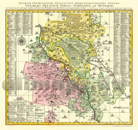 Die Ämter Annaburg, Pretzsch, Torgau, Schweinitz und Mühlberg, gehörten zum MEISSNISCHER und KURKREIS des Kurfürstentums Sachsen. Der Kartograph Peter Schenk (der Jüngere) brachte 1757 diese Karte heraus, welche jetzt im Verlag Rockstuhl als farbenprächtiger Nachdruck erschienen ist. Eine schöne flächenkolorierte Karte. Oben die Titelkartusche und unten links die Erklärungen. Links und rechts neben der Karte befindet sich ein Suchregister. Die Kartuscheninschrift lautet: ´Accurate Geographische Delineation Derer Chursächsischen Ammter Annaburg, Pretzsch, Torgau, Schweinitz, und Mühlberg mit denen darzu Gehörigen Städten, Flecken, Dorffschafften, einzeln Häusern, und angrenzenden Orthen in Amsterdam by P. Schenk mit Königl. und Churfürstlichen Sächss. Privilegio´. Auf der Karte finden wir folgende Städte und Dörfer sowie markante Punkte: Amt Annaburg mit den Ortschaften Annaburg, Arnsnest, Beyern, Buckau, Döbrichau, Döhlen, Fermerswalde, Frauenhorst, Kähmitzsch, Lebien, Löhsen, Mähdel, Purzien, Rahnsdorff, Rosenfeld, Zülßdorff, Zeckeritz Amt Pretzsch mit den Ortschaften Bösewig, Corbien Vorw., Düssnitz, Gahmen, Groß Korgau, Klein Dröben, Klein Korgau, Maucken Vorw., Merschwiz, Patzschwiz, Preztsch, Priesitz, Sachau, Wörblitz, Zornigal Amt Torgau mit den Ortschaften Audenhayn, Bockwitz, Belgern, Bennewiz, Blanckenau Vorw., Camitz, Cöllitz, Cöllm, Crannichau, Cunitzwerda, Dalenberg, Döbeltitz, Döbern, Dommitsch, Drebelgar, Drögnitz, Durreichenbach, Elßnitz, Falckenberg, Graditz, Gräffendorff, Grossewig, Heyde, Kathewitz, Klingenhayn, Klitzschen, Kobershayn, Korgitsch, Kultsche, Langenreichenbach, Loßwig, Liebersee, Mahitschen, Mahla Vorw., Mehderitzsch, Melpitz, Meltewitz, Meltitz, Mockerehna, Neusorge, Neuden, Neusen, Olganitz, Piestel, Pollwitz, Pressel, Probsthayn, Reppiz Vorw., Röchniz, Roitsch, Schilderhayn, Schöne, Schildau, Seydewiz, Sitzenroda, Staupitz, Strelln, Süptitz, Taura, Torgau, Treben, Treptitz, Trossin, Vogelgesang, Wesenig, Weidenhayn, Wildenhayn, Wildschutz, Wölsau, Zeckeritz, Zinna, Zschackau Amt Schweinitz mit den Ortschaften Ahlsdorff, Arnsdorff, Artzberg, Axien, Bathen, Bernsdorff, Bethau, Belddien, Brausitz, Brandis, Burcken, Busch Kühnsdorff, Clöden, Closse, Cremitz, Dautschen, Dixförde, Dubro, Eulenau, Freywalda, Gorsdorff, Görenwitz, Grabo, Grasso, Grauwinkel, Grochwitz, Groß Korga, Groß Träben, Hartmannsdorff, Hemsendorff, Hetzberg, Hinter See, Hohen Kühnsdorff, Hohndorff, Holzdorff, Horst, Ießen, Kaucklitz, Klein Korge, Kreyschau, Labrun, Leine, Lichtenburg, Linde, Lindwerder, Löben, Meuselcko, Mockwit, Mönchenhöffen, Naundorff, Neuerstädt, Nichtewitz, Plossig, Premsendorff, Prettin, Rade, Rehefeld, Rehhayn, Reichau, Rettig, Rühlsdorff, Schmielsdorff, Schöne Eiche, Schönewalda, Schützberg, Schweinitz, Steinsdorff, Stoltzenhayn, Triestewitz, Vorstadt Hertzberg, Waltersdorff, Werchau, Werda, Wildenau, Zwethau, Zwiesigko Amt Muhlberg mit den Ortschaften Alt Belgern, Altenau, Aussig, Beyersdorff, Blumberg, Boragck, Borschitz, Brottewitz, Burxdorff, Coßdorff, Cröbeln, Fichtenberg, Hayda, Kathewitz, Kavertitz, Kauxdorff, Kysa, Klein Staritz, Keobenthal, Köttlitz, Kötten, Kreynitz, Langenrieth, Lausen, Lehndorff, Lorenz Kirch, Martins Kirchen, Möglentz, Mühlberg Altestadt, Mühlberg Neuestadt, Nauwalda, Öltzschau, Oschätzgen, Packisch, Plotha, Prieschkau, Pülßwerda, Puschwitz, Reichenhayn, Saxdorff, Schweditz, Seydewitz, Staritz, Stehla, Wendisch burschitz, Wetzendorff, Wohlau, Würdenhayn, Zeckeritz Genaue Markierungen sind nahezu auf allen Schenk-Karten des KURFÜRSTENTUM SACHSEN zu erkennen. Wie EIN STEINBRUCH, EINE ZIEGELSCHEUNE, EIN KALKOFEN, EIN SCHMIDT (Schmied), HERRN SCHÄFEREY, BAUERN SCHÄFEREI, EIN GASTHOFF, KLEINE SCHENCK, BRAU RECHT. Mühlen finden wir auf der Karte, und da sind: WASSER MÜHL, BRETH MÜHL, PAPIER MÜHL, OEL MÜHL, LOH MÜHL, WALK MÜHL UND WIND MÜHL. Zu sehen sind auch Straßen und Brücken. Die Frage: »Was für eine Kirche hatte der Ort?« kann genau nachgeprüft werden, man unterscheidet nach SUPERINTENDUR, ADJUNCTUR, EINE HAUPT KIRCHE, EINE FILIAL KIRCHE WELCHE ALTZEIT MIT EINER GERADEN LINIE AN IHRE HAUPTKIRCHE HENGT, UND EINE KAPELLE. Die damaligen Schlösser wurden unterschieden in EIN KOENIGLICHES - ODER FÜRSTLICHES SCHLOSS oder in ein GRÄFLICHES- ODER ADLIGES SCHLOSS. Ein Dorf war nicht nur ein Dorf, sondern EIN DORFF MIT EINER KIRCHE UND RITTERGUTHE oder EIN DORFF MIT EINER KIRCHE UND VORWERK oder EIN DORF MIT EINER KIRCHE DARAUFF UND EIN PASTORAT. Gemessen wurde mit EINE GEMEINE TEÜTSCHEN MEILE DEREN 15 EINEN GRADUM MACHEN. Die Karte hat ein Außenformat (Breite x Höhe) 72 x 68 cm - Darstellungsgröße (Breite x Höhe) 66 x 65 cm. Darstellung 20 % vergrößert zum Original