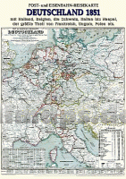 Nachdruck. Post- und Eisenbahn-Reisekarte Deutschland, Holland, Belgien, die Schweiz, Italien bis Neapel, der größte Teil von Frankreich, Ungarn, Polen etc. 1 S., mit besonderer Berücksichtigung auf Eisenbahnen und Dampfschifffahrt und unter Beigabe mehrerer Tabellen etc., Originalzeichnung von G. Hansen kgl. bayr. Oberlieutenant, ehemals Stahlstich. Verlag von Senz & Comp., Nürnberg, 1851 - Reprint im Verlag Rockstuhl. MIT 38 DEUTSCHE BUNDESSTAATEN auf der Karte gut gekennzeichnet: I. Oestereich, II. Preussen; III. Bayern; 4. Hannover; 5. Würtemberg; 6. Sachsen; 7. Baden; 8. Mecklenburg-Schwerin; 9. Mecklenburg-Strelitz; 10. Chur-Hessen; 11.Großherzogtum Hessen; 12. Holstein(zu Dänemark); 13. Oldenburg; 14. Luxemburg, und Limburg (Niederlande); 15. Nassau; 16. Braunschweig; 17. Sachsen-Weimar-Eisenach; 18. Sachsen-Meiningen-Hildburghausen; 19. Sachsen-Coburg-Gotha; 20. Sachsen-Altenburg; 21.Waldeck; 22. Lippe; 23. Reuss-Schleitz und Reuss-Greiz; 24. Schwarzburg-Rudolstadt und Schwarzburg-Sondershausen, 25. Hohenzollern-Sigmaringen und Hohenzollern-Hechingen; 26. Anhalt-Dessau, Bernburg, Köthen; 27. Schaumburg-Lippe; 28. Hessen-Homburg sowie 29. mit Lichtenstein, Hamburg, Lübeck, Bremen, Frankfurt. Außenformat (Breite x Höhe) 60 x 84 cm - Darstellungsgröße (Breite x Höhe) 59 x 69 cm