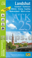 Topographische Wanderkarte für die Gegend um Landshut mit Wanderwegen und Radwanderwegen. Für Touristik und Freizeit bietet die ATK25 in Verbindung mit einer plastischen Geländeschummerung das aktuelle Netz der Wanderwege (Rot) und Radwege (Grün). Einzelne touristische Hinweise und Symbole ergänzen die Kartendarstellung. Das eingetragene UTM-Kilometergitter gewährleistet dem GPS-Nutzer Koordinatensicherheit. Gegenüber den Rahmenblättern (herkömmliche Blätter im Regelblattschnitt) 1:25.000 stellt ein ATK25-Kartenblatt eine 3,5-fach größere Kartenfläche dar. Die einzelnen Karten haben zu Ihren Nachbarblättern einen 4 km breiten Überlappungsbereich. Kartenbeispiel aus der Serie Blattübersicht (externer Link)