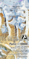Landkarte des Georeliefs des örtlichen Pamirs (Pik-Lenin-Gebiet). Maßstab 1:100.000, hergestellt aus Daten der Shuttle Radar Topography Mission. Mit 50-Meter-Höhenlinien und sehr vielen Höhenangaben und Benennungen von Berggipfeln. Polychrome Kombinationsschummerung, plastische 1.000-Meter-Farbhöhenschichten, 1-Minuten-Gitternetz (Bezugssystem WGS84). Abstandstreue Azimutalprojektion mit Zentralpunkt 72° 54` E 39° 21` N. Karte für die Pik Leipzig Pamir Expedition 2012