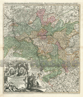 Der Kartograf Johann Baptist Homann veröffentlichte 1707 zwei Frankenkarten. Die Karte von Oberranken als `Oberer und größerer Teil von FRANKEN` und eine zweite von Unterfranken als `Unterer und mindere Teil von FRANKEN`. Minderer Teil bedeutete damals `kleinere` Teil. Die Karte von Unterfranken besticht vor allem durch die farbliche Darstellung der einzelnen Herzog- und Fürstentümer der damaligen Zeit. Sie zeigt Rheinfranken mit dem Erzbistum Mainz zwischen Koblenz, Fulda, Schwäbisch-Gmünd und Landau sowie dem Rheinlauf von Philippsburg bis Andernach. Unten links befindet sich eine schöne Titelkartusche mit Porträts, Allegorien und Wappen. Die Karte hat die Inschrift: `Circuli Franconiae Pars Occidentalis, exhibens simul integrum ferè Electoratum Moguntinum Quem unacum Tractu Totius Moeni Fluminis Reverendißimo et Eminentißimo Principi ac Dno Dno Lothario Francisco S. Sedis Mog Archi. Episc. S.R.I. per Germ. Archi Cancellario et Electori, Episc. Bambergensi, Domino suo Clementißimo humillimè offert author Io. Bapt. Homann Norimbergae.`. Einige Regionen auf der Karte sollen hier genannt werden: Alzey, Aschaffenburg, Bad Homburg vor der Höhe, Bad Kreuznach, Bad Orb, Bad Rappenau, Bad Sobernheim, Bensheim, Bingen am Rhein, Braunfels, Buchen, Butzbach, Darmstadt, Dimstein, Durkheim, Erbach, Eppingen, Franckenhal, Frankfurt am Main, Gelheim, Gelnhausen, Gießen, Grünstadt, Hanau, Heidelberg, Heilbronn, Heppenheim, Ingelheim, Kaiserlautern, Kirchheimbolanden, Kirn, Klingenberg am Main, Koblenz, Künzelsau, Langenselbold Laubach, Lautereck, Liburg an der Lahn, Lich, Mainz, Mannheim, Meisenheim, Michelstadt, Miltenberg, Montabur, Mosbach, Nassau, Necarsulm, Oberburg, Odenbach, Öhringen, Philipsburg, Schlüchtern, Schotten, Simmern, Sinsheim, Stromberg, Speier, Speyer, Walldürn, Wetzlar, Wielburg, Wolfstein, Worms. Der Kupferstecher, Kartograph und auch Verleger Johann Baptist Homann wurde 1664 in Oberkammlach bei Mindelheim in Schwaben geboren. Hier besuchte er das Jesuitengymnasium, ging nach Würzburg, wo er 1687 das Würzburger Dominikanerkloster verlies, um nach Nürnberg zu gehen. Hier erhielt er 1691 die Nürnberger Bürgerrechte. Zur gleichen Zeit beschäftigte er sich mit dem kolorieren von Kupferstichen. Schon ein Jahr später stellte er seinen ersten eigenen Stich der Öffentlichkeit vor. Von 1693 bis 1697 hielt sich Homann in Allersberg, Wien, Erlangen und Leipzig auf. Nach seiner Rückkehr 1697 nach Nürnberg wirkte er als Mitarbeiter der Kartographen Funck und Sandrart. Mit 38 Jahren - im Jahr 1702 - begründete er seinen Verlag. Unsere Karte vom `Fränkischen Kreis` erschien 1707. Homann starb Johann Baptist Homann 1724 in Nürnberg. Seine Nachfolger veröffentlichten später weiter Karten unter dem Namen `Homanns Erben`. Die Karte hat eine Größe von 52,5 X 60,6 cm und wird gerollt in einer stabilen Pappversandhülse geliefert.
