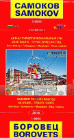 Große Panoramakarte der Skipisten, mit Stadtplan, Hotelverzeichnis und Wanderkarte für die Umgebung von Borowez. Alle Beschriftungen jeweils in kyrillischer und lateinischer Schrift, touristische Informationen auch auf deutsch.