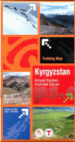 Große doppelseitige topographische Trekkingkarte von Kirgisien auf der Grundlage der russischen Militärkarte. Kyrillische Ortsnamen und Landschaftsbezeichnungen sind durch lateinische Versionen ersetzt. Die beiden Kartenteile grenzen nicht unmittelbar aneinander.