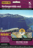 Turkart Pro - Doppelseitig bedruckte Karte. Die Vorderseite zeigt eine sehr detaillierte topographische Wanderkarte über das Gebiet der westlichen Hardangervidda bis zum Sörfjord. Auf der wird dieser Bereich als Schattenkarte mit klaren Bergen und Landschaftsformen gezeigt. Blattschnitte : Südnorwegen 1:100.000