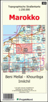 Topographische Landkarte von Marokko auf Grundlage der OpenStreetMap und aus anderen Quellen. Entsprechend dem aktuellen Fortschritt der Kartengrundlage sind außerordentlich viele kleine Details im Wegenetz erkennbar. Alle Beschriftungen erfolgen soweit verfügbar in Englisch und Arabisch. Enthält Höhenlinien, Pässe und Geländeschattierung. Verschiedene touristisch interessante Punkte sind besonders hervorgehoben, z.B.: Zeltplätze, Hotels, Einkaufsmöglichkeiten, Restaurants. Blattschnitte der Marokko-Straßenkarten von ProjektNord