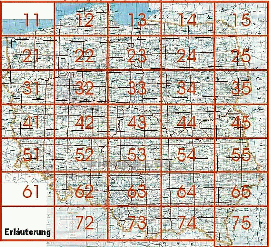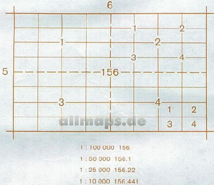 HINWEIS: Die dicken braunen Linien geben die 1:100.000 Blattschnitte wieder. diese teilen sich in 4x 1:50.000 oder 16x 1:25.000.